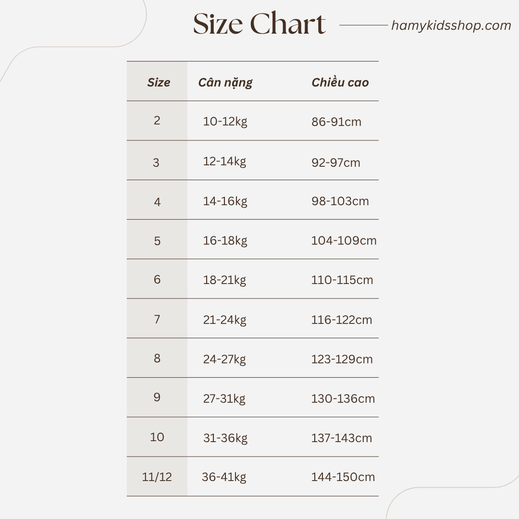 - Tuỳ thuộc vào sự phát triển của cân nặng và chiều cao của mỗi bé theo từng độ tuổi mà các thông số chỉ mang tính chất tham khảo. Nếu bé cao mẹ chọn size theo chiều cao còn bé nặng thì mẹ chọn size theo cân nặng