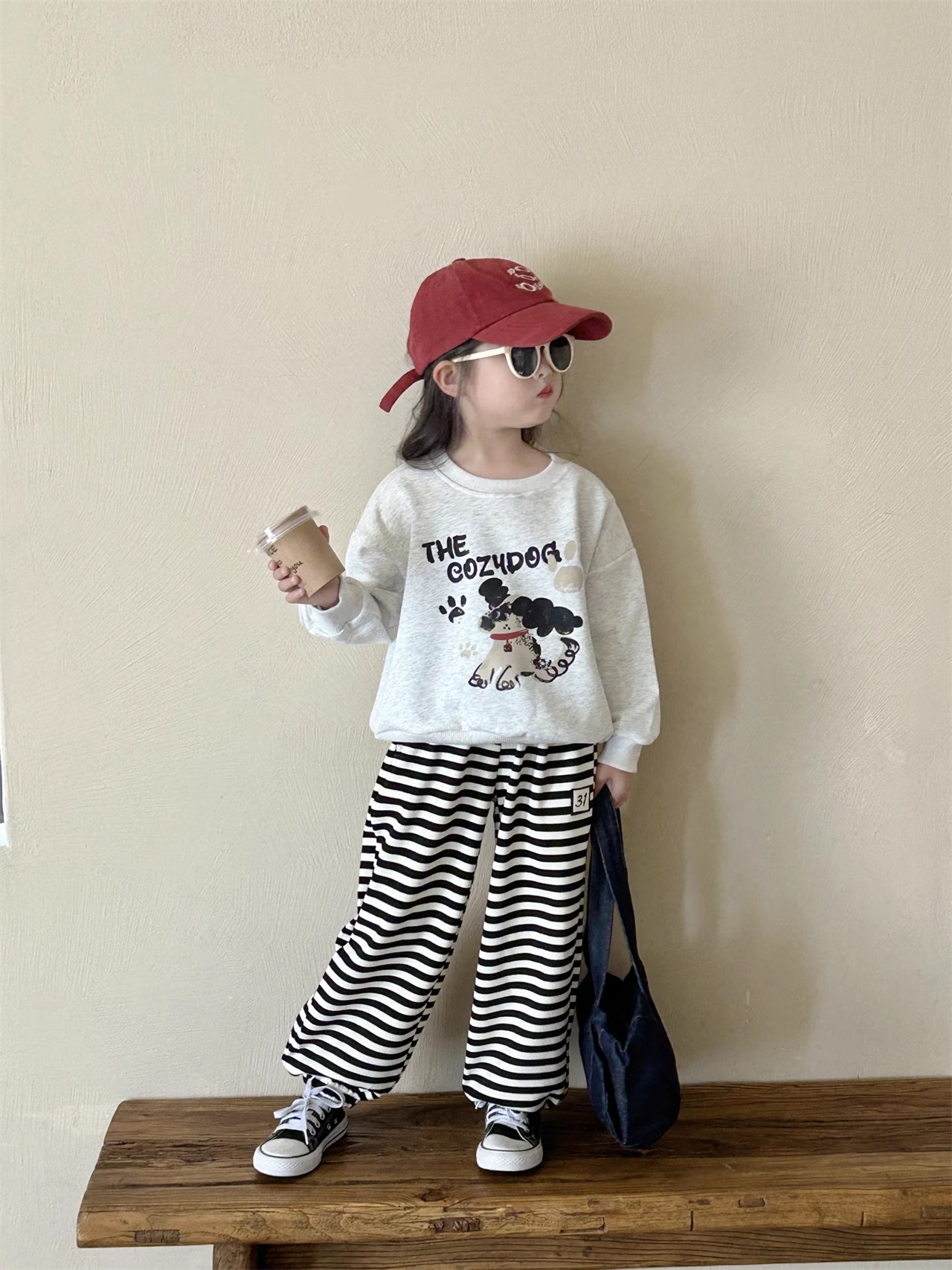 Thiết kế: Áo in hình cún siêu dễ thương, phom rộng trendy; quần kẻ form suông rộng rãi, dây rút/lưng thun ôm vừa vặn, bé vận động thoải mái cả ngày.