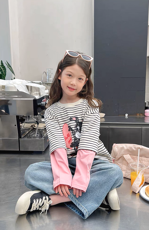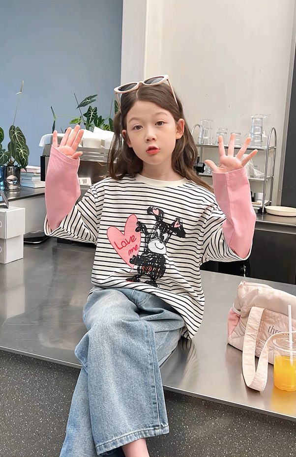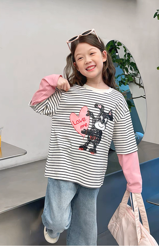 Set Áo Dài Tay Kẻ Sọc Phối Hồng Hình Cún Đáng Yêu Mix Quần Jean Dài