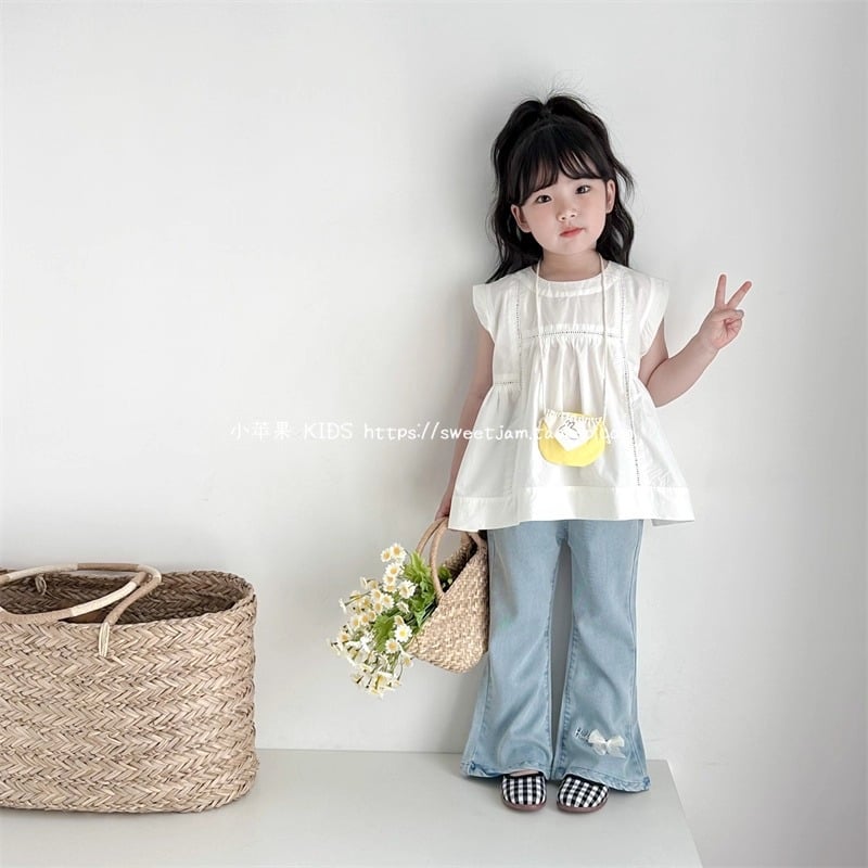 Set Áo Thô Cotton Trắng Quần Jean Mềm Ống Loe Đính Nơ