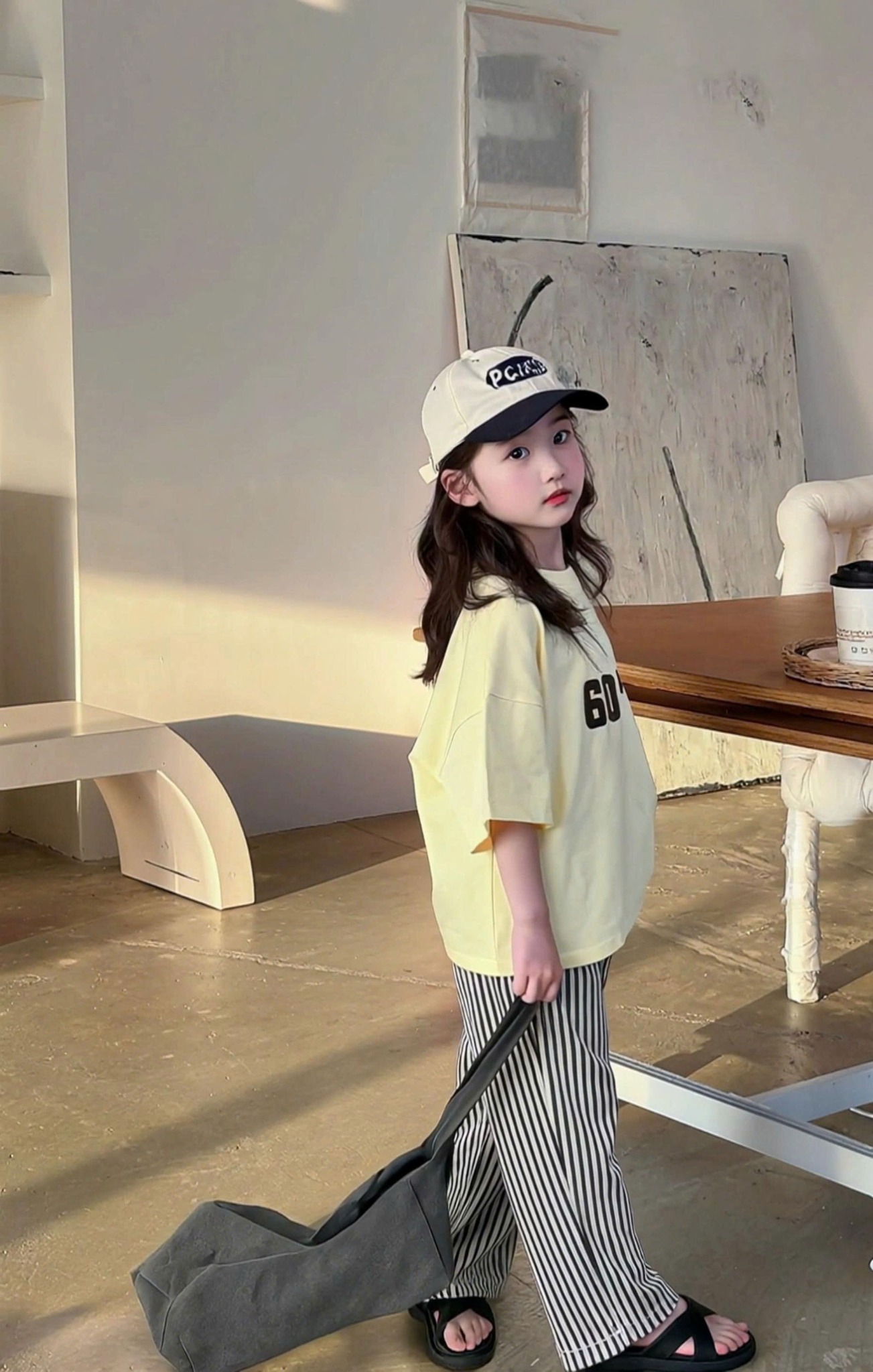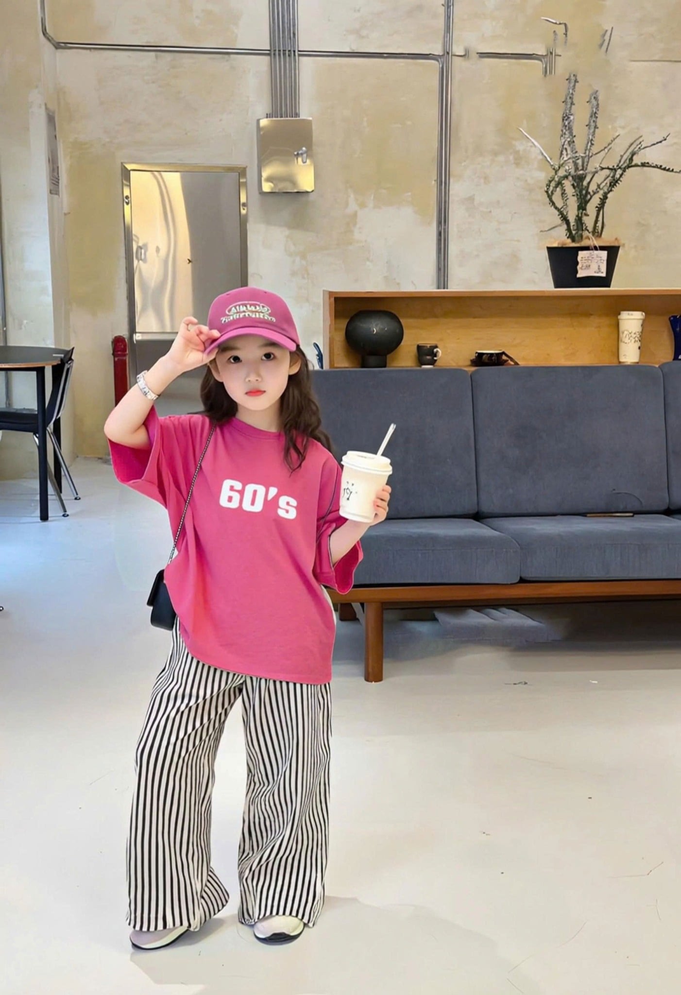 Set Bé Gái Trendy Áo Form Rộng Cotton 4C Quần Dài Ống Suông Vải Sọc Xốp
