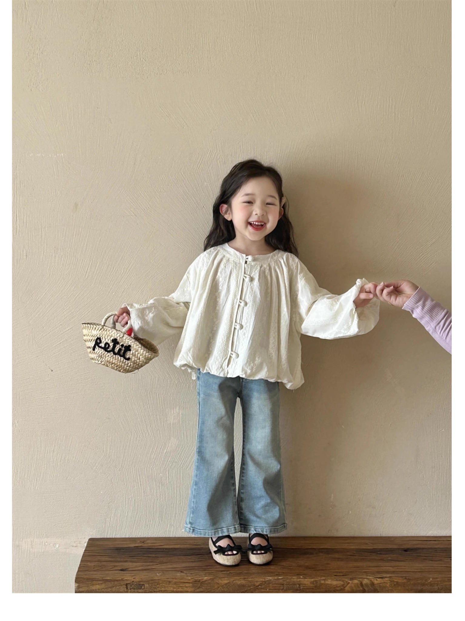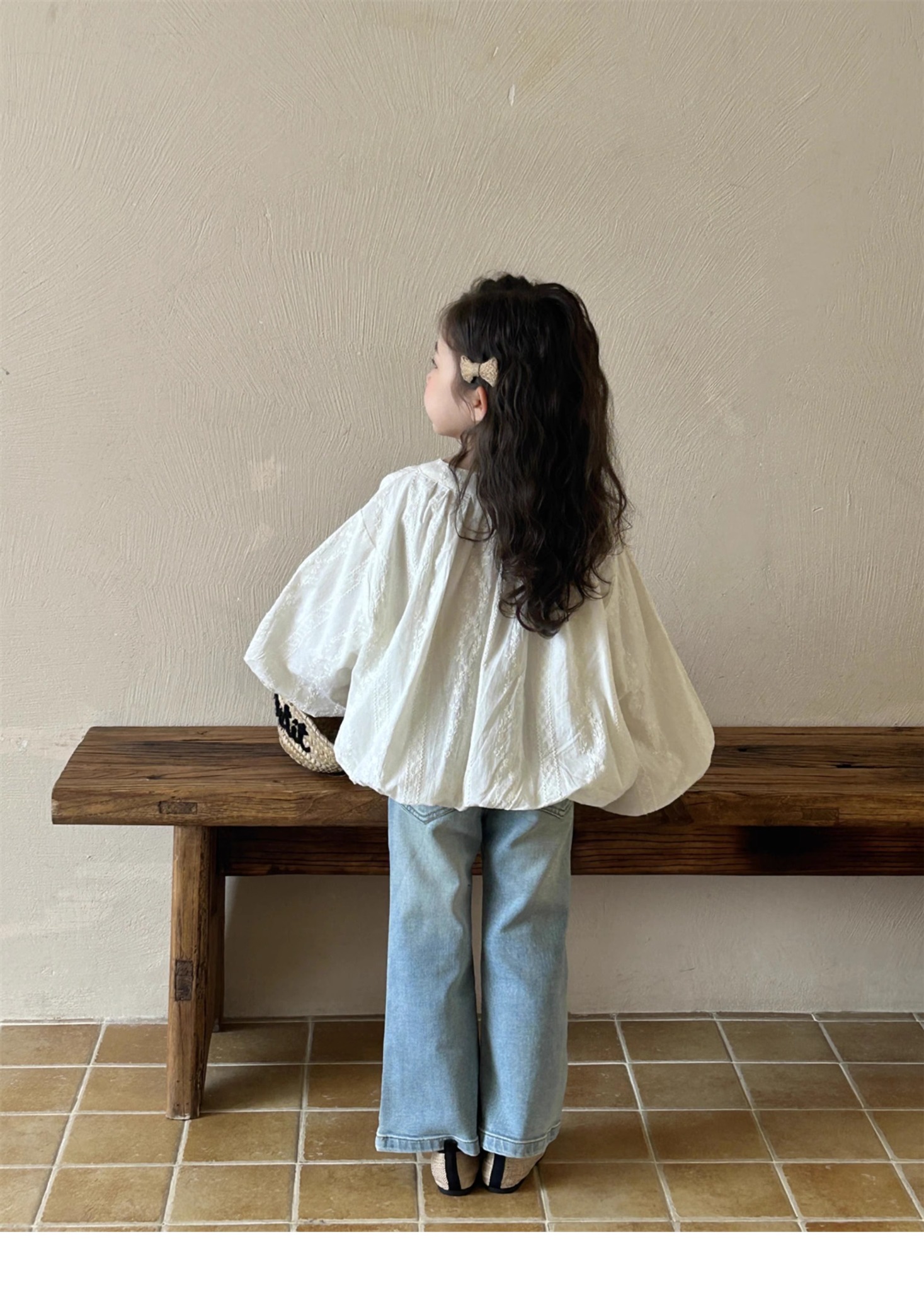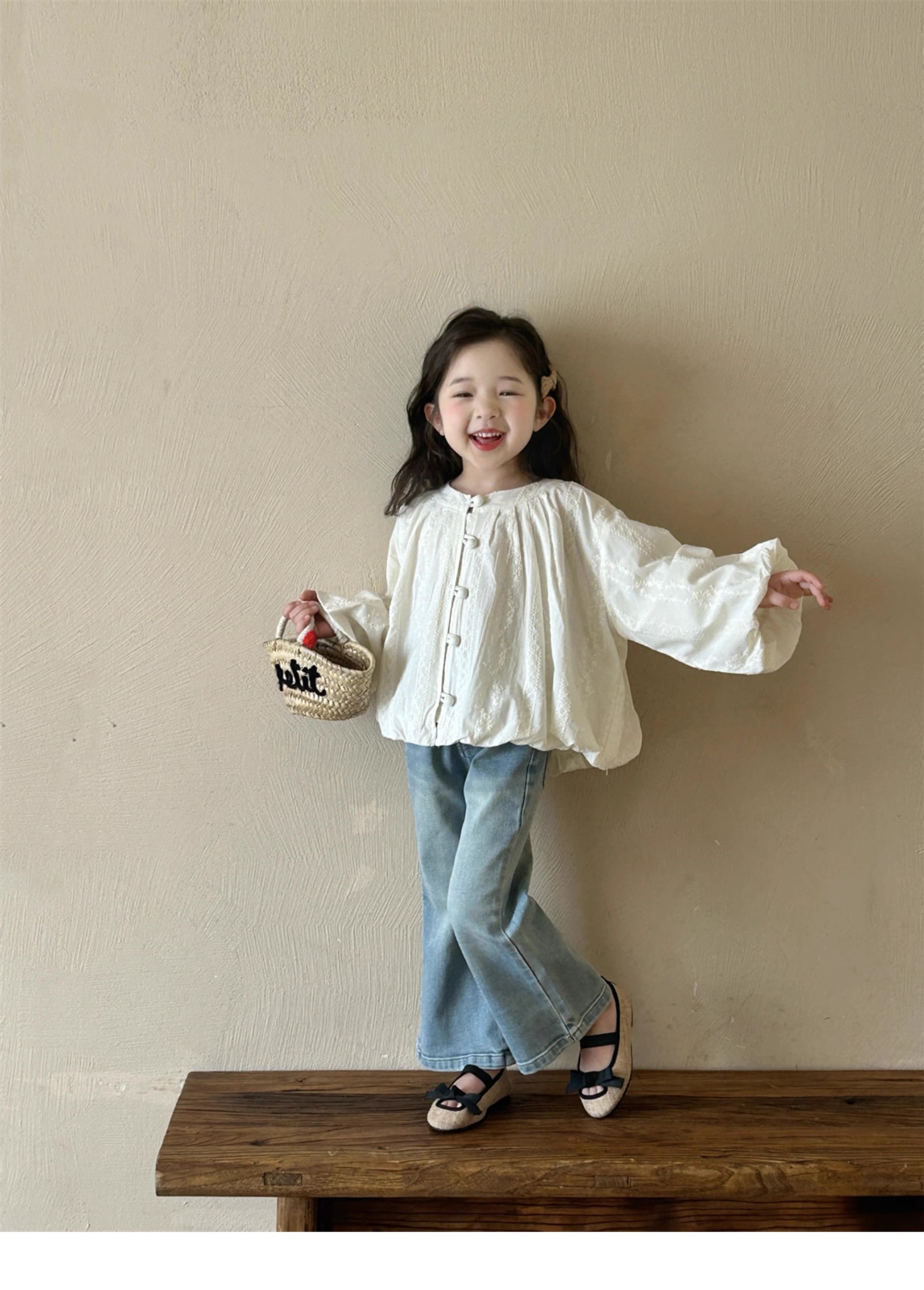 Set Tiểu Thư Áo Thêu Trắng Dài Tay Phối Khuy Quần Jean Giặt Mài Ống Loe