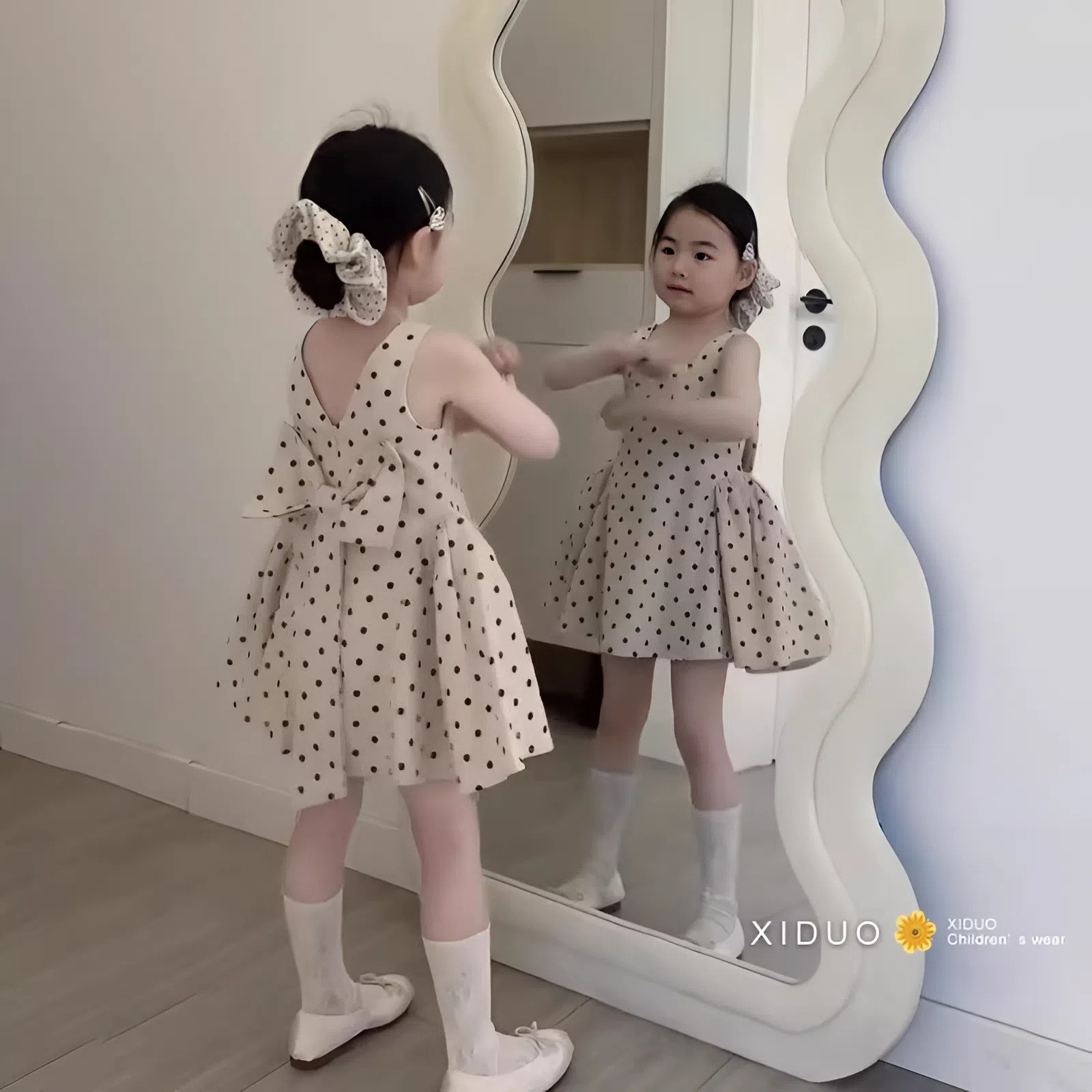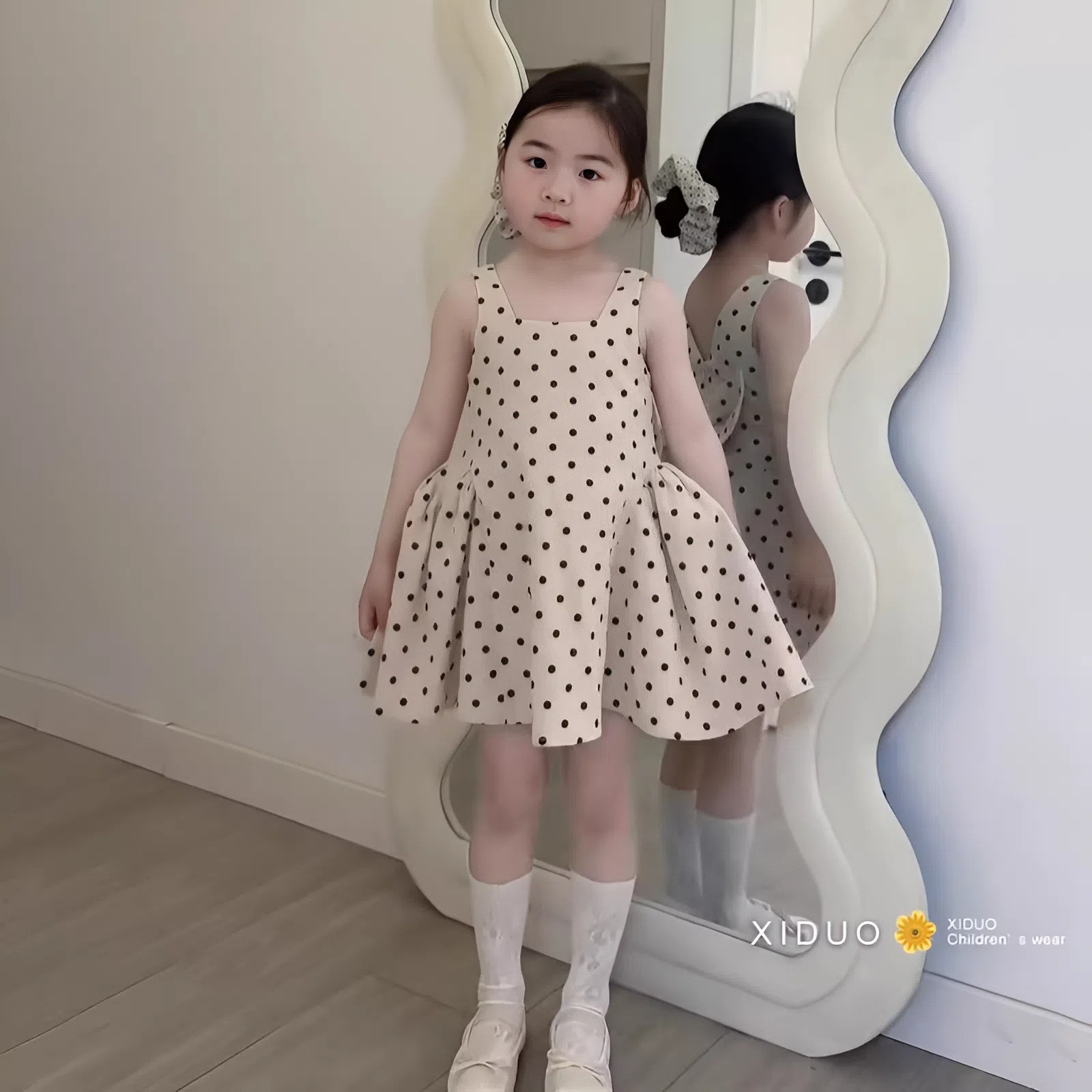 Món quà “nàng thơ” khiến bé yêu tỏa sáng ngay từ cái nhìn đầu tiên: dáng váy xòe bồng nhẹ, chấm bi cổ điển và chiếc nơ bản lớn sau lưng cực duyên - đi chơi, dự tiệc hay chụp ảnh đều thật long lanh.